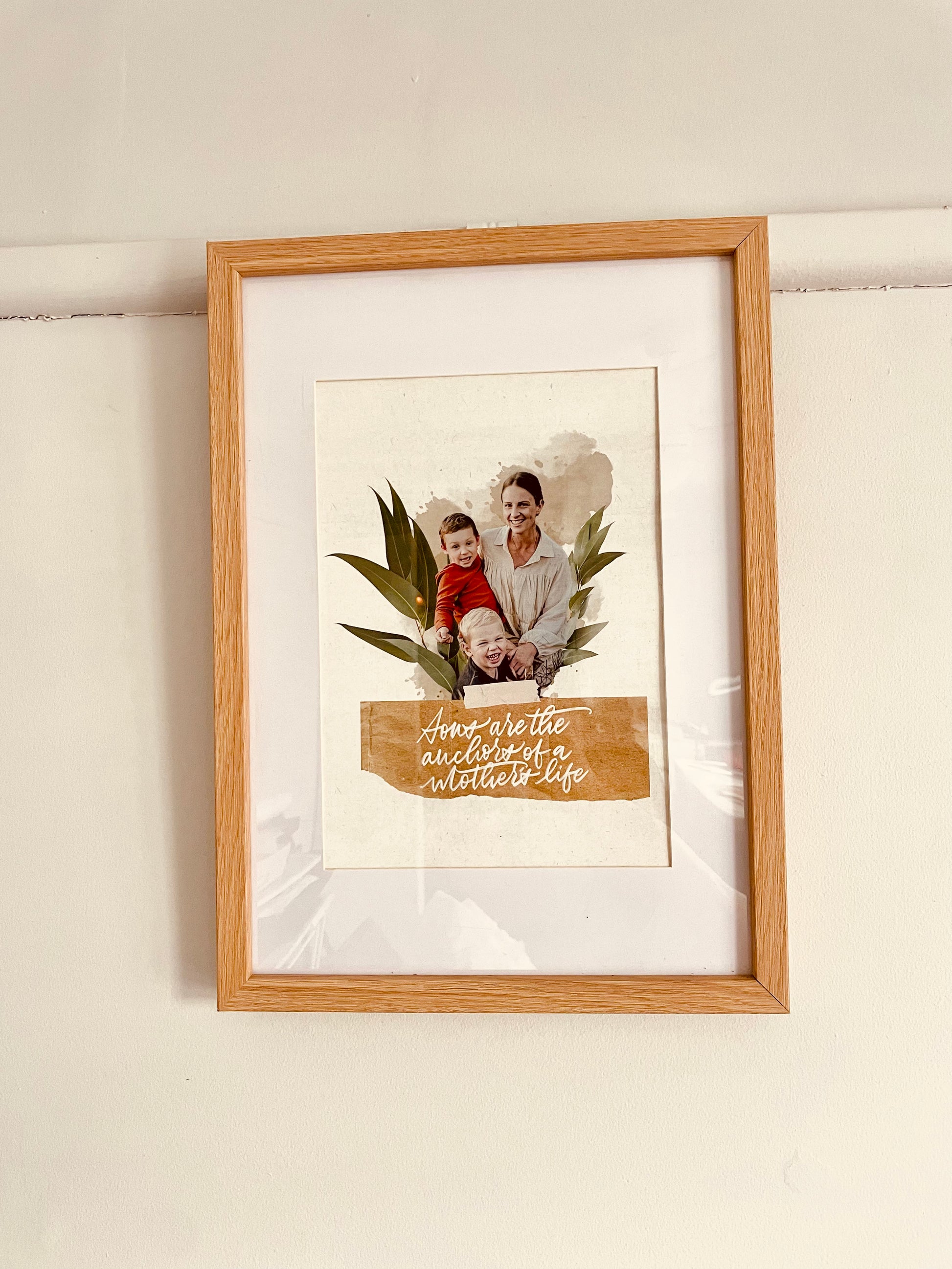 The finished artwork is professionally printed at A4 size and presented in an A3 frame with matting, creating a refined, gallery-style finish.